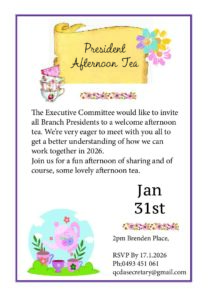 Presidents’ Afternoon Tea Posted on January 9, 2024January 8, 2026 by Vicki 31st January 2026 You are invited to attend the President Afternoon tea, a valuable chance to raise questions and share ideas for 2026. Should the branch president be unavailable, please ensure a representative from the committee attends. RSVP by 17.1.2026 Ph: 0493 451 061 qcdasecretary@gmail.com